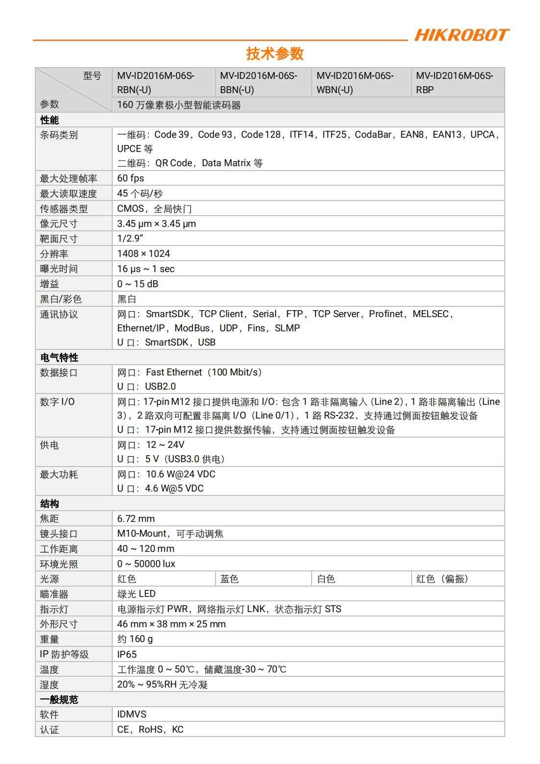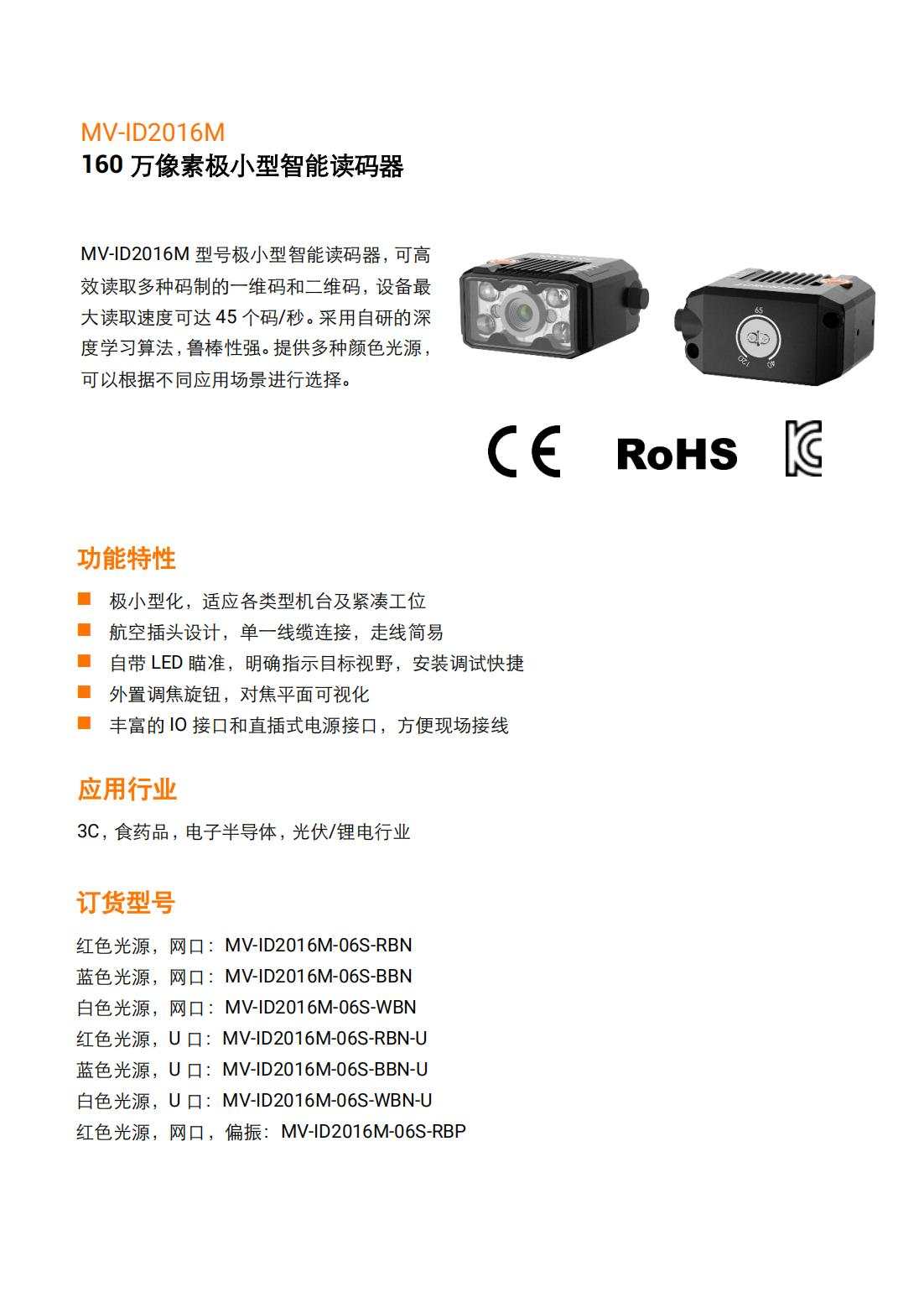 海康机器人HIKROBOT极小型智能读码器MV-ID2016M-06S-RBN