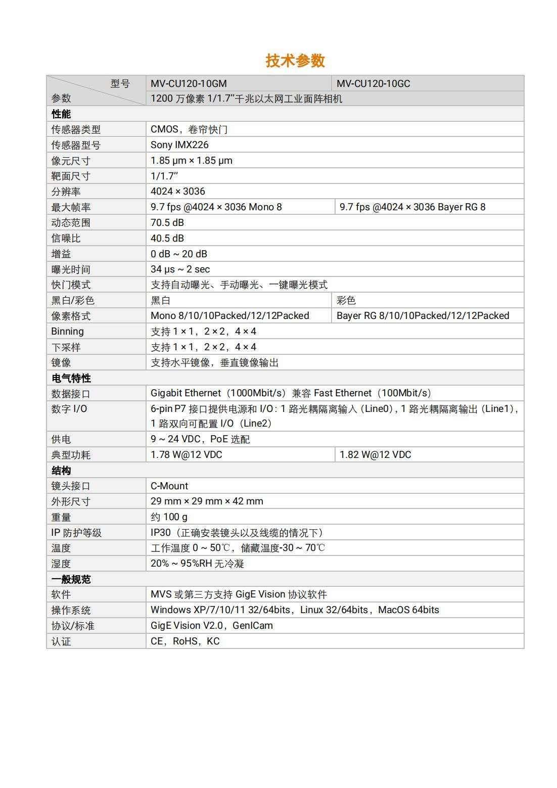 海康机器人HIKROBOT普惠型工业相机MV-CU120-10GC