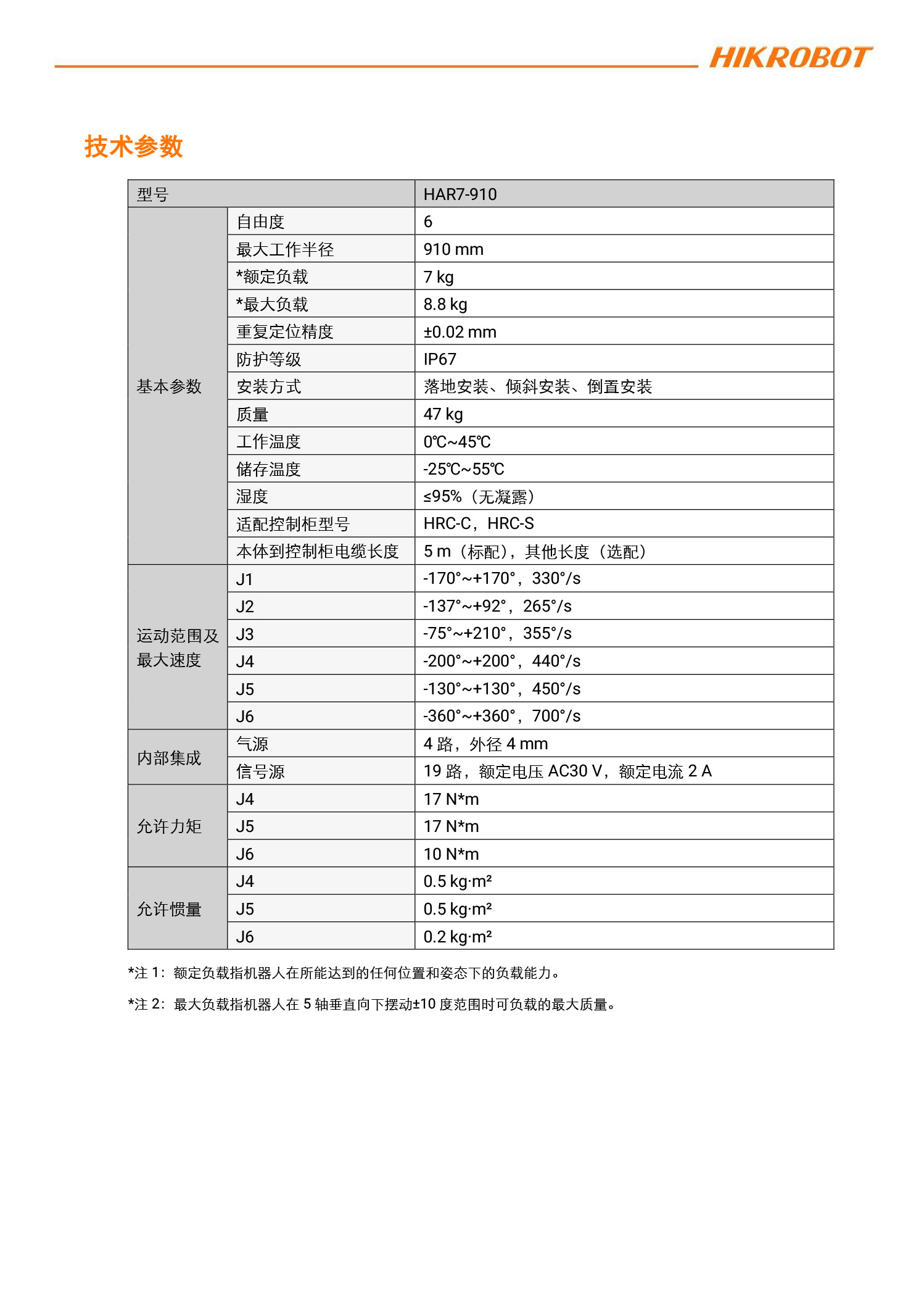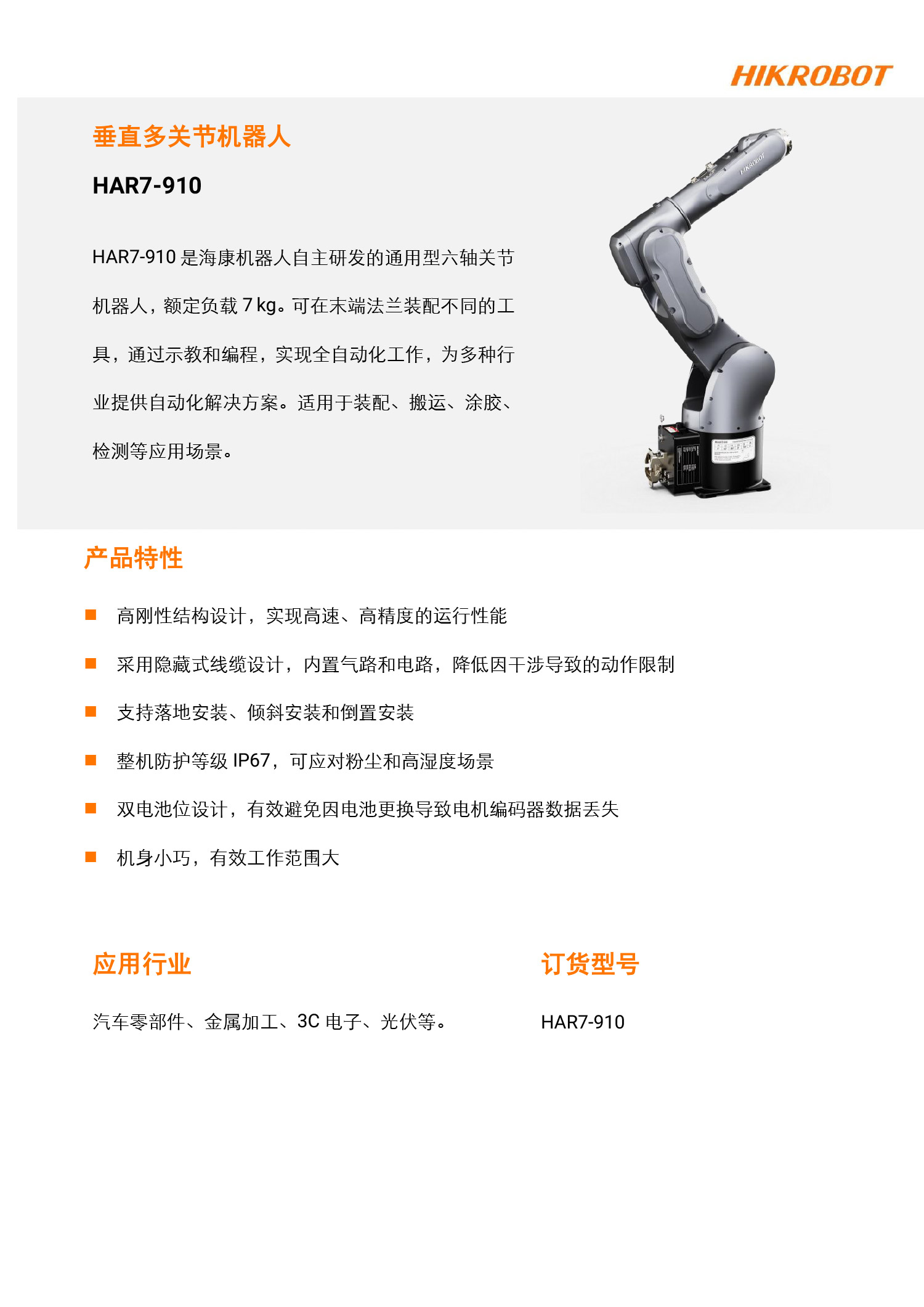 海康机器人HIKROBOT六轴机器人HAR7-910-C5L8-HY