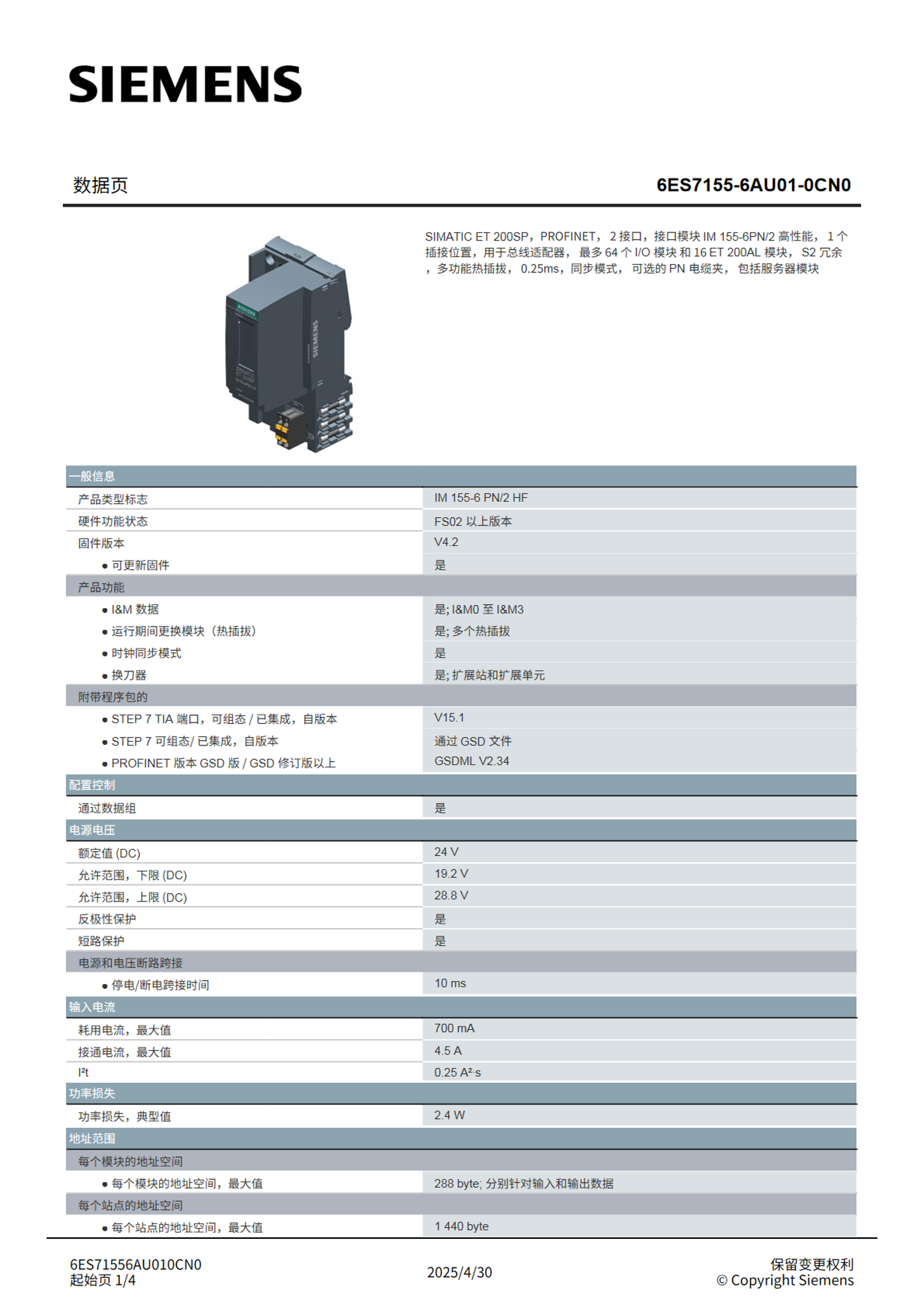 西门子SIEMENS接口模块IM155-6PN/22接口6ES7155-6AU01-0CN0
