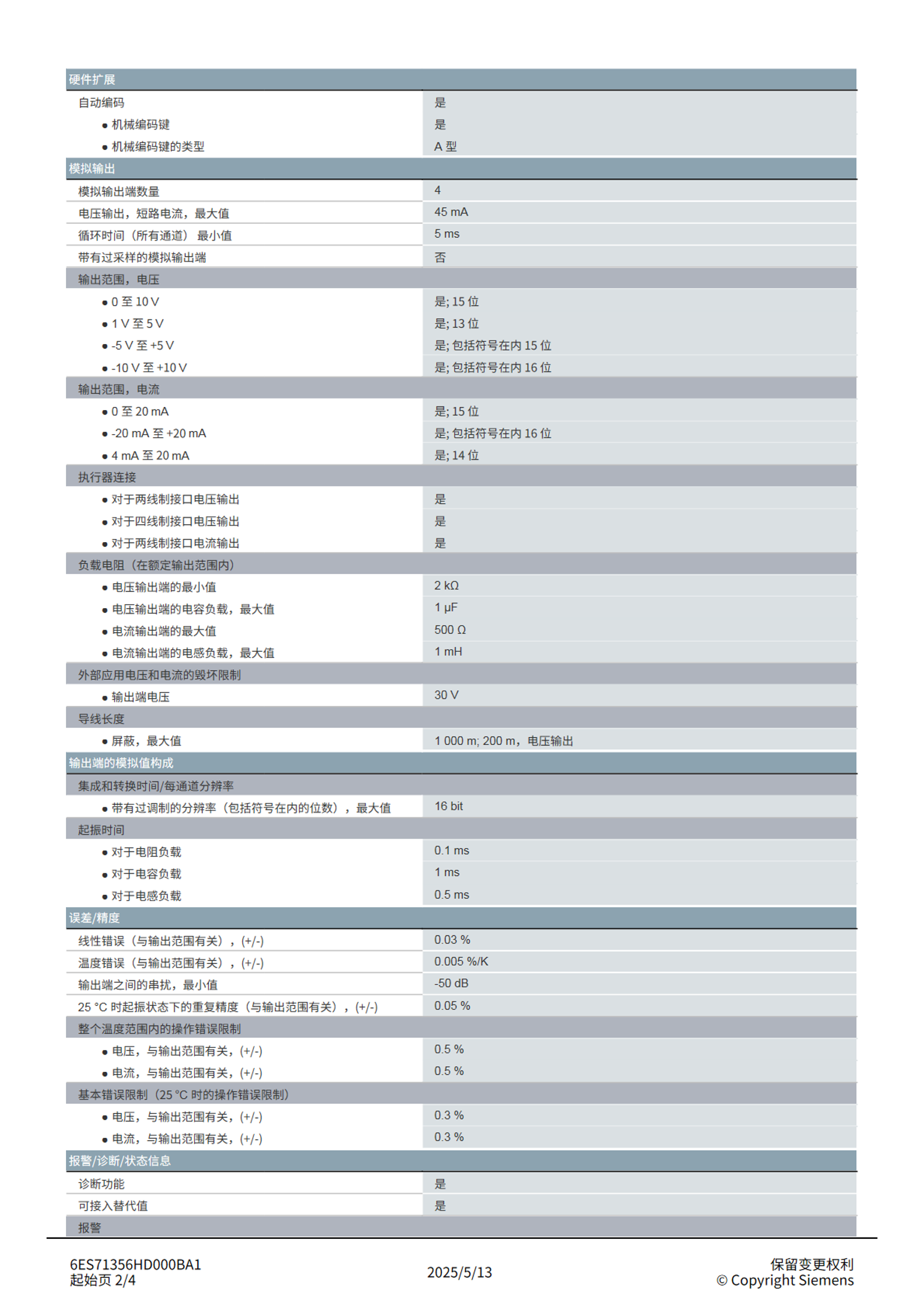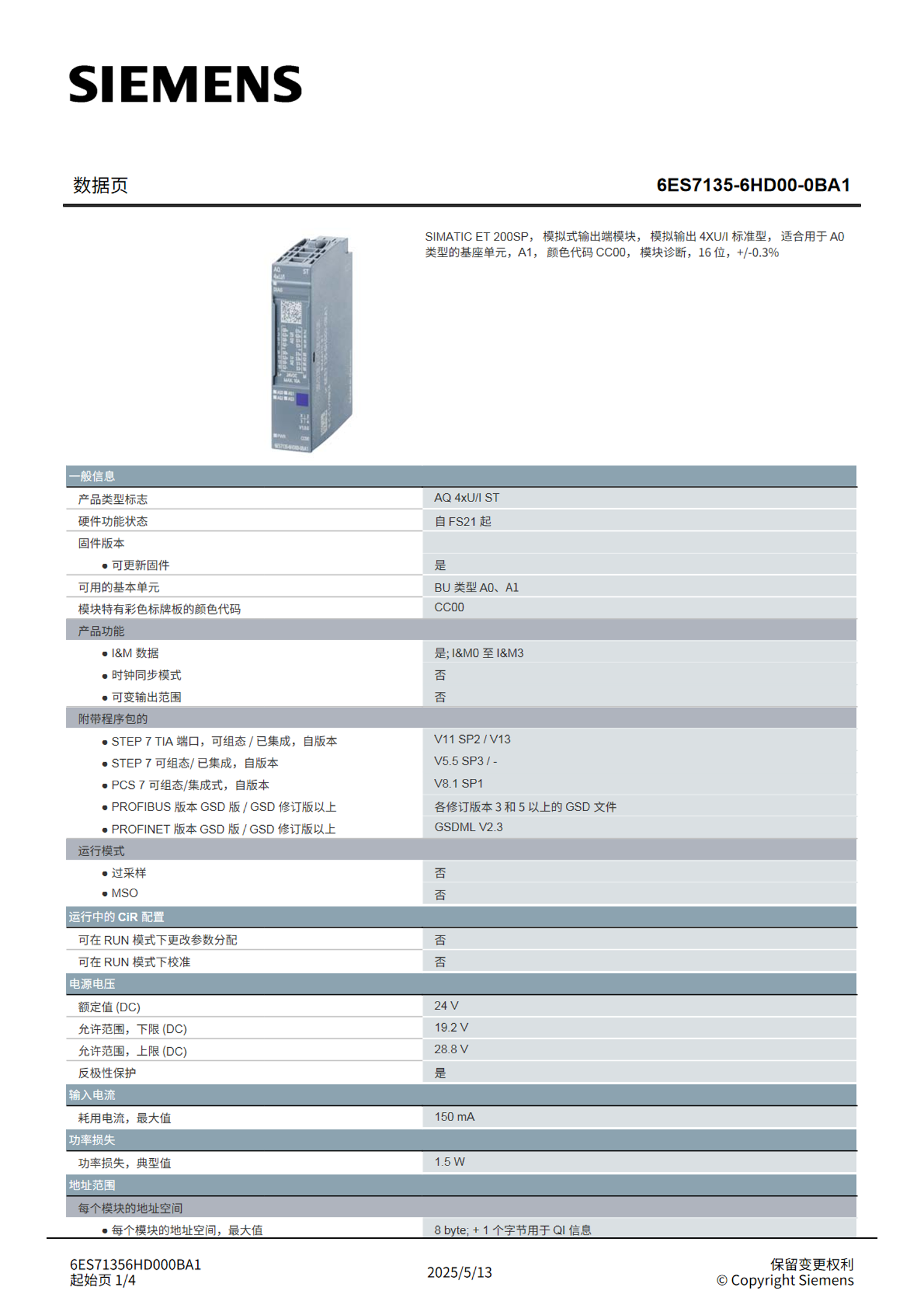 西门子SIEMENS输出模块4XU/I标准型6ES7135-6HD00-0BA1